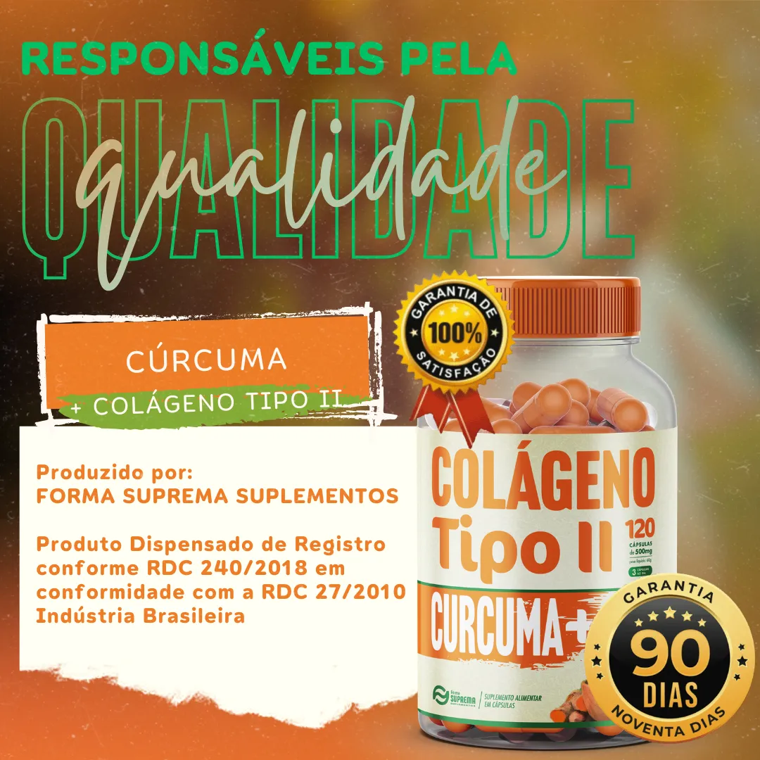 Fórmula pura e de alta qualidade, com 500mg de Cúrcuma padronizada em curcuminóides e Colágeno Tipo II hidrolisado para máxima absorção.